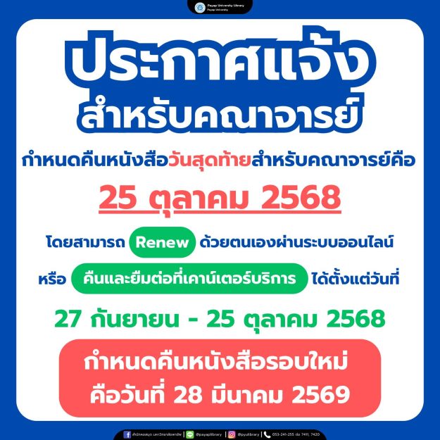 กำหนดคืนและ Renew หนังสือของคณาจารย์ ข่าวประกาศBy Wilairat Chetawan27/09/2025 กำหนดคืนหนังสือวันสุดท้ายสำหรับคณาจารย์ คือวันที่ 25 …