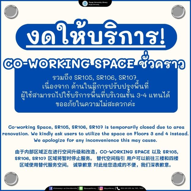 📣 งดให้บริการ CO-WORKING SPACE ชั่วคราว ข่าวประกาศBy Wilairat Chetawan07/11/2025ห้องสมุดงดให้บริการ CO-WORKING SPACE, SR105, SR106 และ …