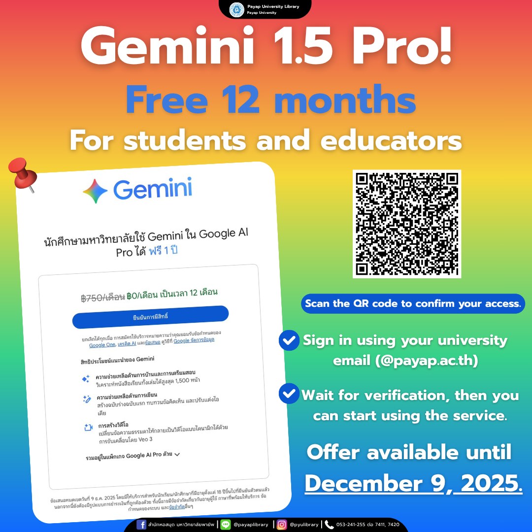 เข้าเว็บไซต์ https://one.google.com/ai-student?g1_landing_page=75 ลงชื่อเข้าใช้งานด้วยอีเมลของสถาบัน (@payap.ac.th) รอการยืนยันสิทธิ์แล้วเริ่มใช้งานได้เลย กดรับสิทธิ์ได้ถึง 9 ธันวาคม 2568 English below Free 12 months Gemini Pro 1.5! For students and educators Access Link : https://one.google.com/ai-student?g1_landing_page=75 Sign in using your university email (@payap.ac.th) Wait for verification, then you can start using it Offer available until December 9, 2025 Category: ข่าวประกาศBy Wilairat Chetawan09/10/2025Related posts📣 ประกาศแจ้งจากห้องสมุดดิวอลด์20/10/2025PYU E-Thesis15/10/2025Payap Library holiday closing schedule on Oct. 202508/10/2025กำหนดคืนและ Renew หนังสือของคณาจารย์27/09/2025New Gadget !18/09/2025IEEE eLearning Library database trial21/08/2025
